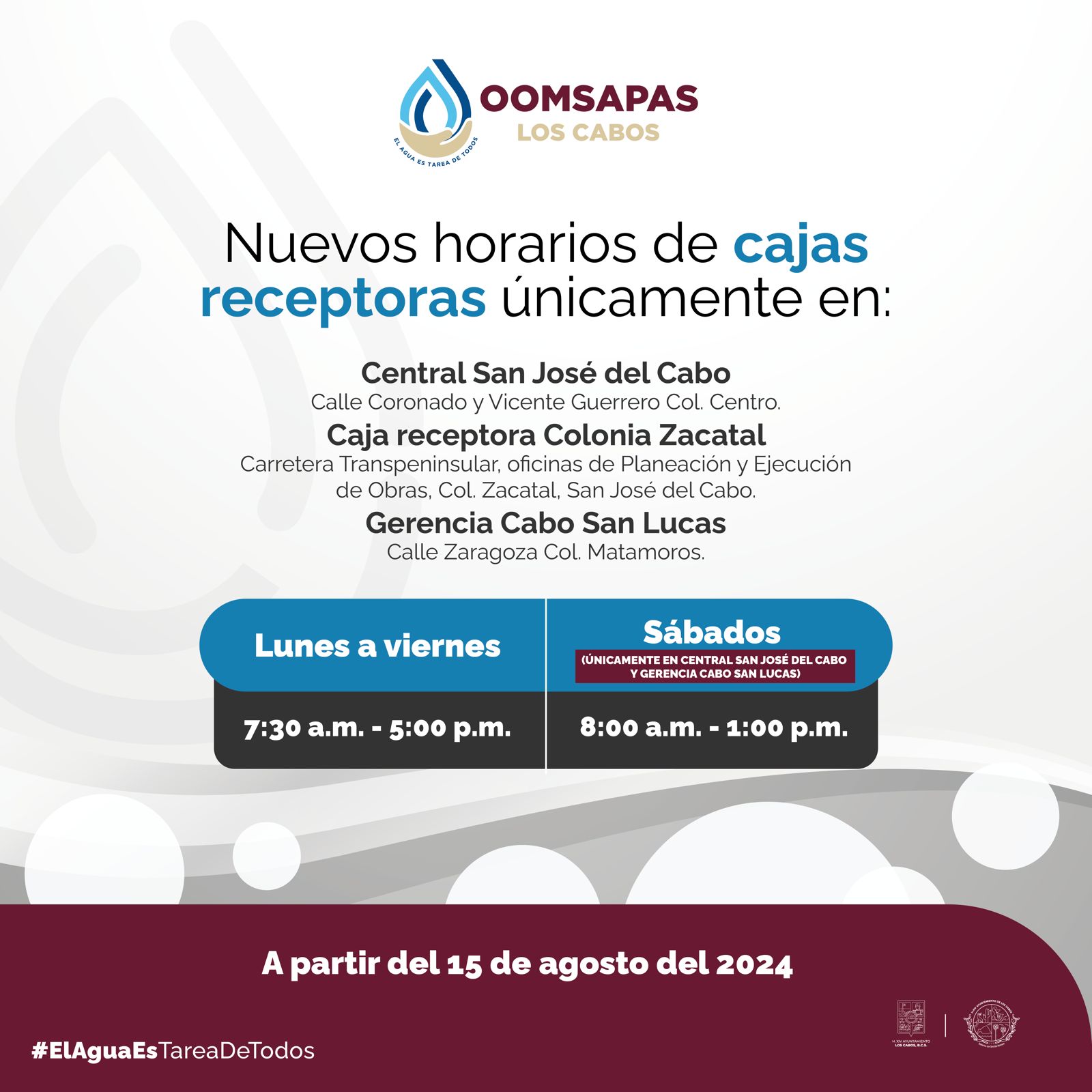 Los Cabos, B.C.S., 14 de agosto 2024.- “A partir de este jueves 15 de agosto se extenderán los horarios de atención en las cajas receptoras de San José del Cabo y Cabo San Lucas; esto con el fin de brindar un mejor servicio a las usuarias y usuarios de Agua Potable en Los Cabos”, así lo informó el coordinador de Recursos Financieros de OOMSAPAS Los Cabos, Daniel Iván Tostado Hernández.