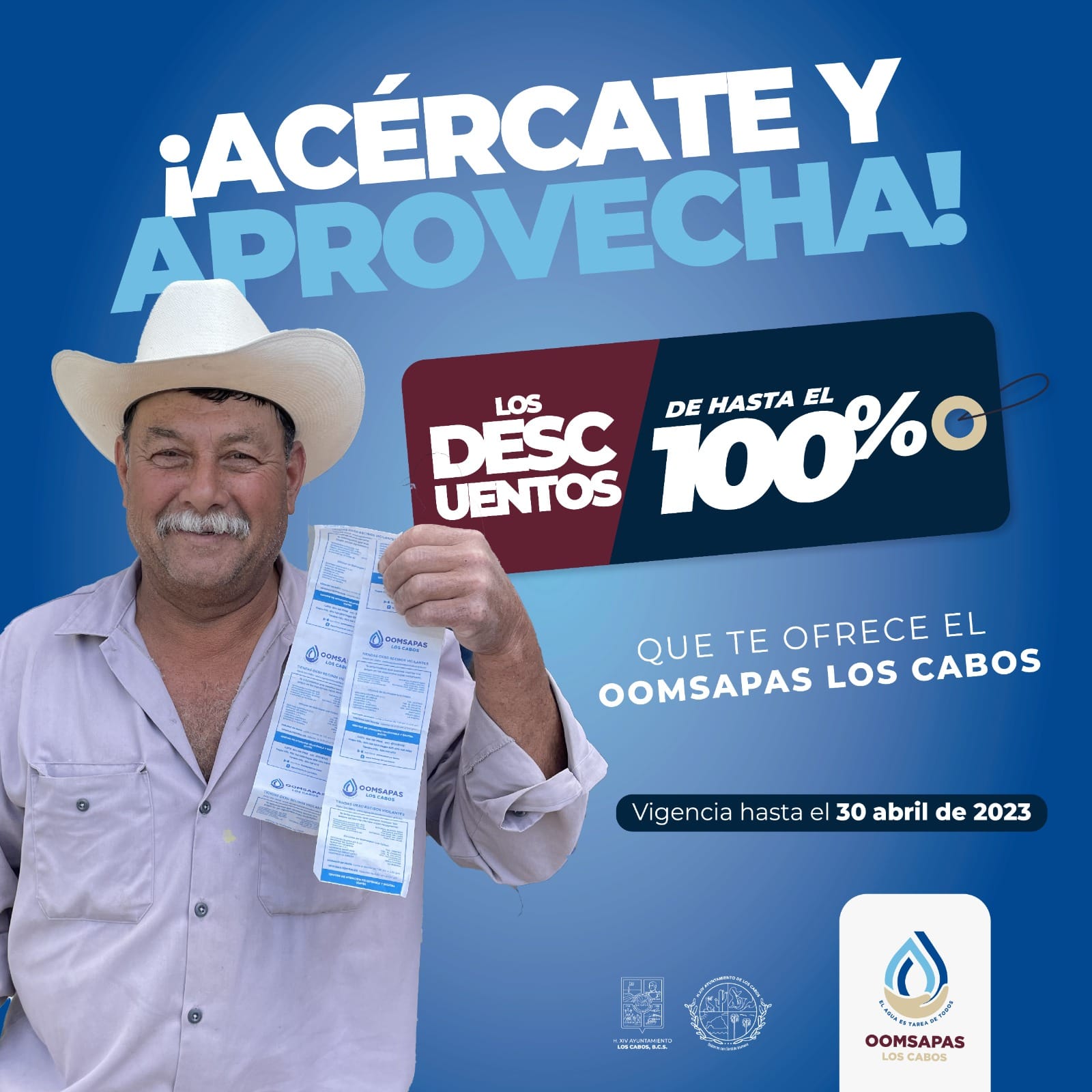 Los Cabos, B.C.S., 07 de marzo 2023.- A las y los usuarios del OOMSAPAS Los Cabos se les invita a acercarse y a aprovechar los descuentos de hasta el 100% en recargos e intereses; la fecha límite para hacerlo es el 30 de abril del año en curso y contempla a los tres tipos de usuarios: doméstico, comercial e industrial.