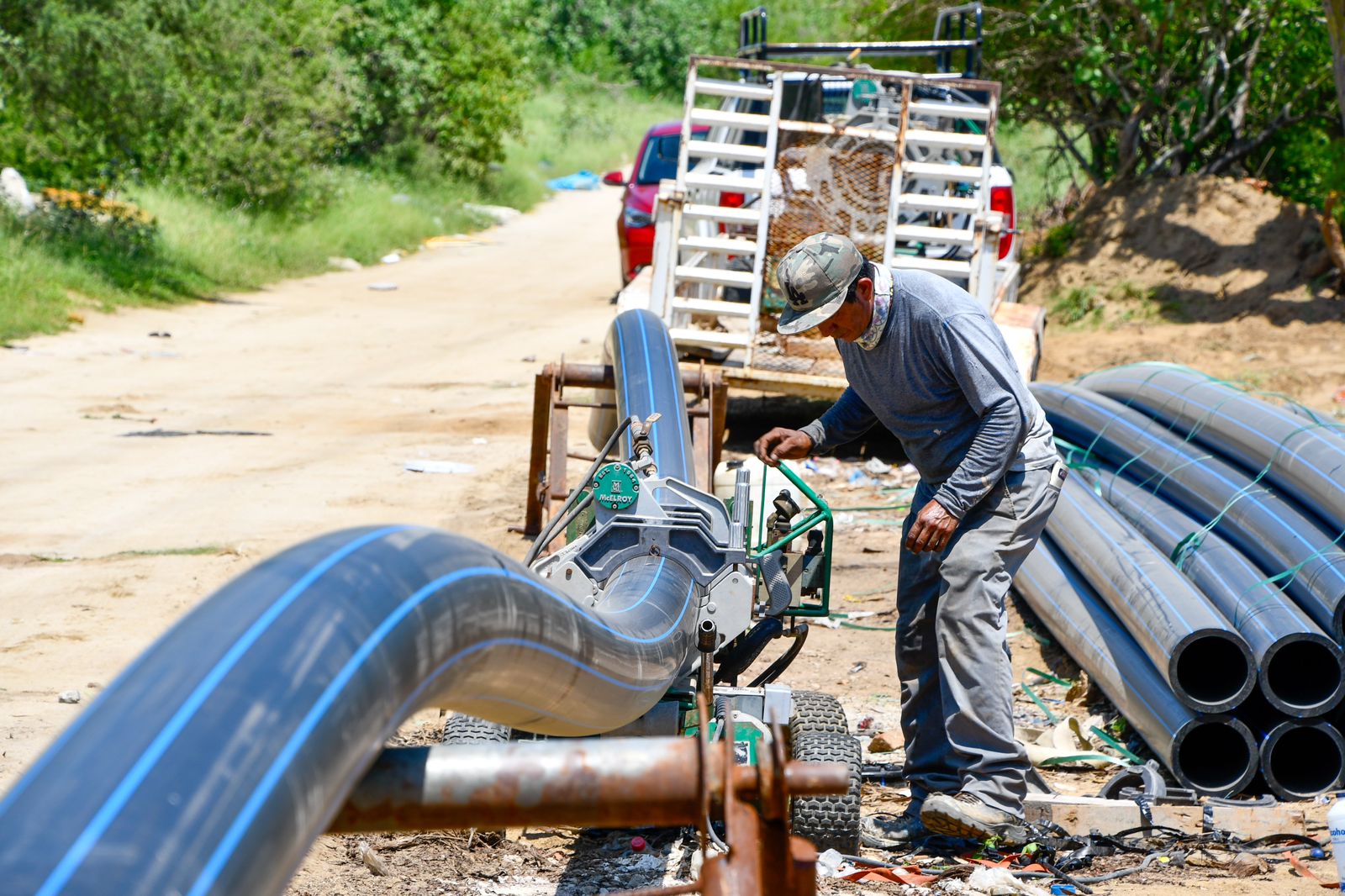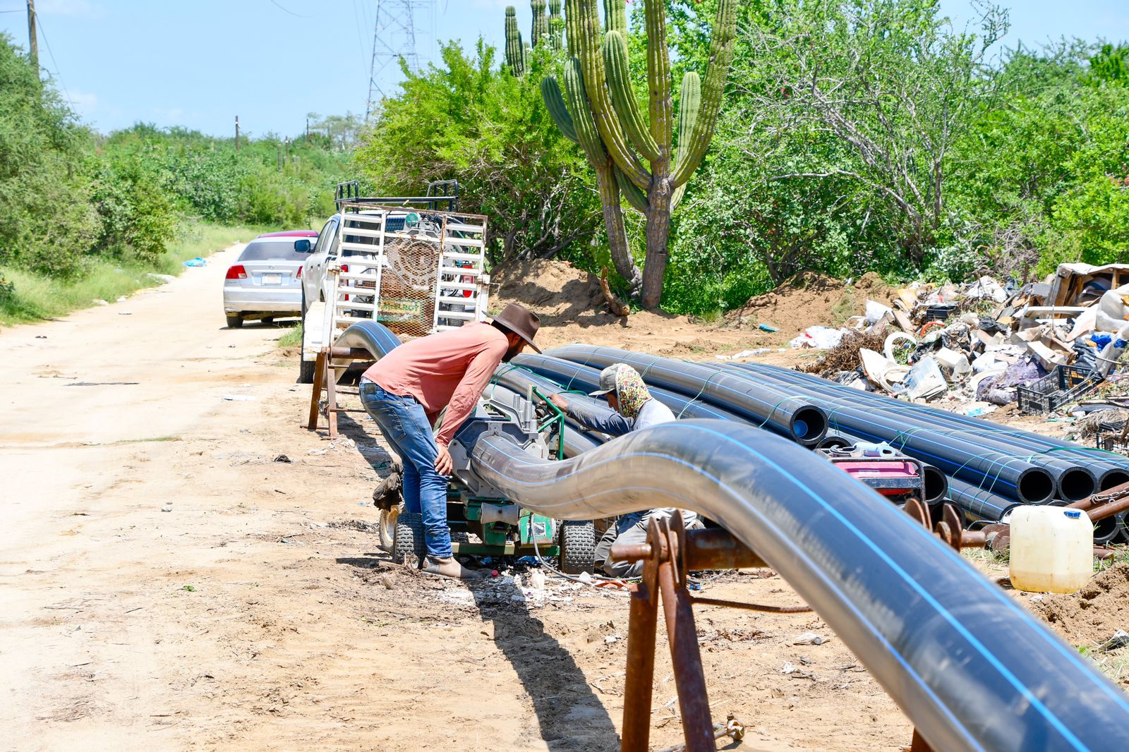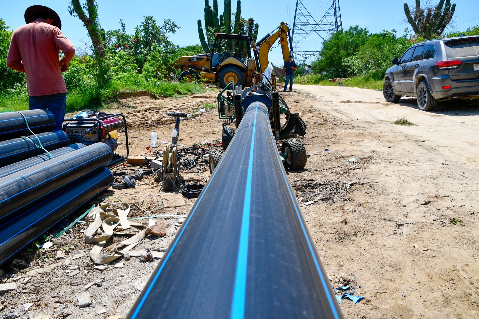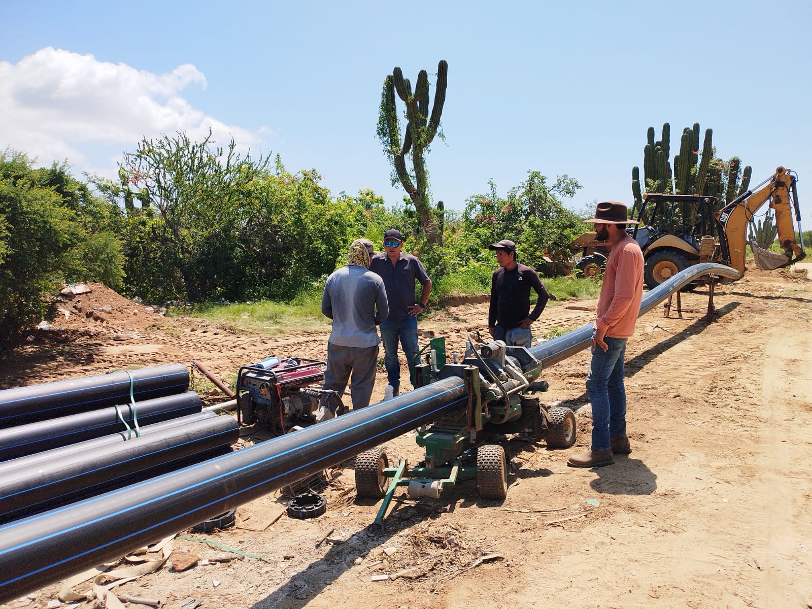 Los Cabos, B.C.S., 19 de septiembre 2023.- Luego del banderazo de inicio a los trabajos de construcción de 3 mil 600 tomas domiciliarias, -en una primera etapa-, el equipo de la Dirección de Planeación y Ejecución de Obras del Organismo Operador Municipal del Sistema de Agua Potable, a cargo del ingeniero Igal Castro Castellanos, realiza los trabajos de termofusión (unión de tuberías mediante proceso térmico) de las tuberías que distribuirán el vital líquido proveniente de la Potabilizadora San Lázaro para beneficio de 24 mil 300 habitantes.