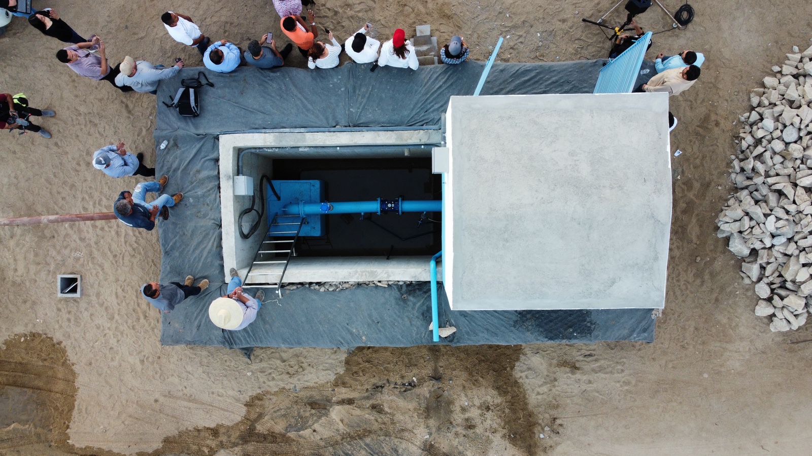 Acerca de esta obra: es resultado del trabajo en equipo a través de la Dirección de Planeación y Ejecución de Obras que dirige Igal Castro Castellanos en coordinación con la Dirección de Operación y Mantenimiento a cargo de Miguel Ceseña, la cual consistió en el equipamiento del pozo con una bomba de 100 caballos, la instalación de un arrancador y equipo de energía eléctrica: un pedestal de 150 KVA, un arrancador siemens de 125 en capacidad, un tren de descarga, y los 1,100 metros lineales de tubería de polietileno de alta densidad.