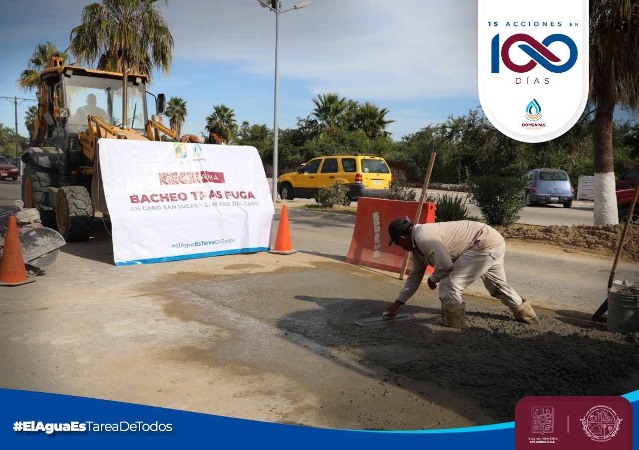 Los Cabos, B.C.S., 26 Ene.- Durante los primeros 100 días de Gobierno, el Organismo Operador Municipal del Sistema de Agua Potable, Alcantarillado y Saneamiento de Los Cabos implementó el programa “Bacheo tras Fuga”, con el cual se atendieron, -en una primera etapa-, 202 baches en San José del Cabo y Cabo San Lucas.