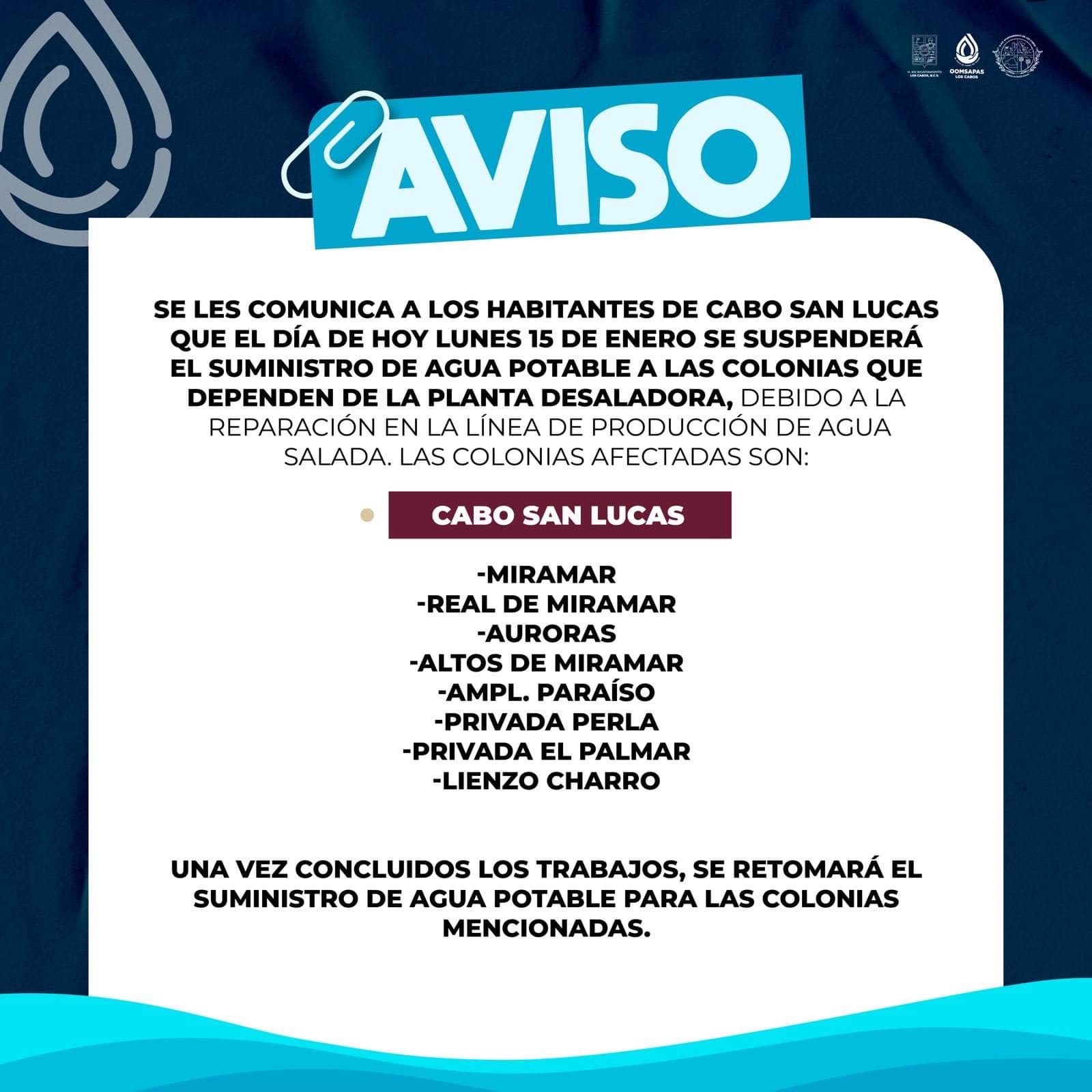 Los Cabos, B.C.S., 15 de enero del 2024.- A los habitantes de la delegación de Cabo San Lucas, se les informa que hoy debido a la reparación en una línea de producción de agua salada, el tandeo para las colonias que dependen de esta fuente de abastecimiento fue interrumpido.