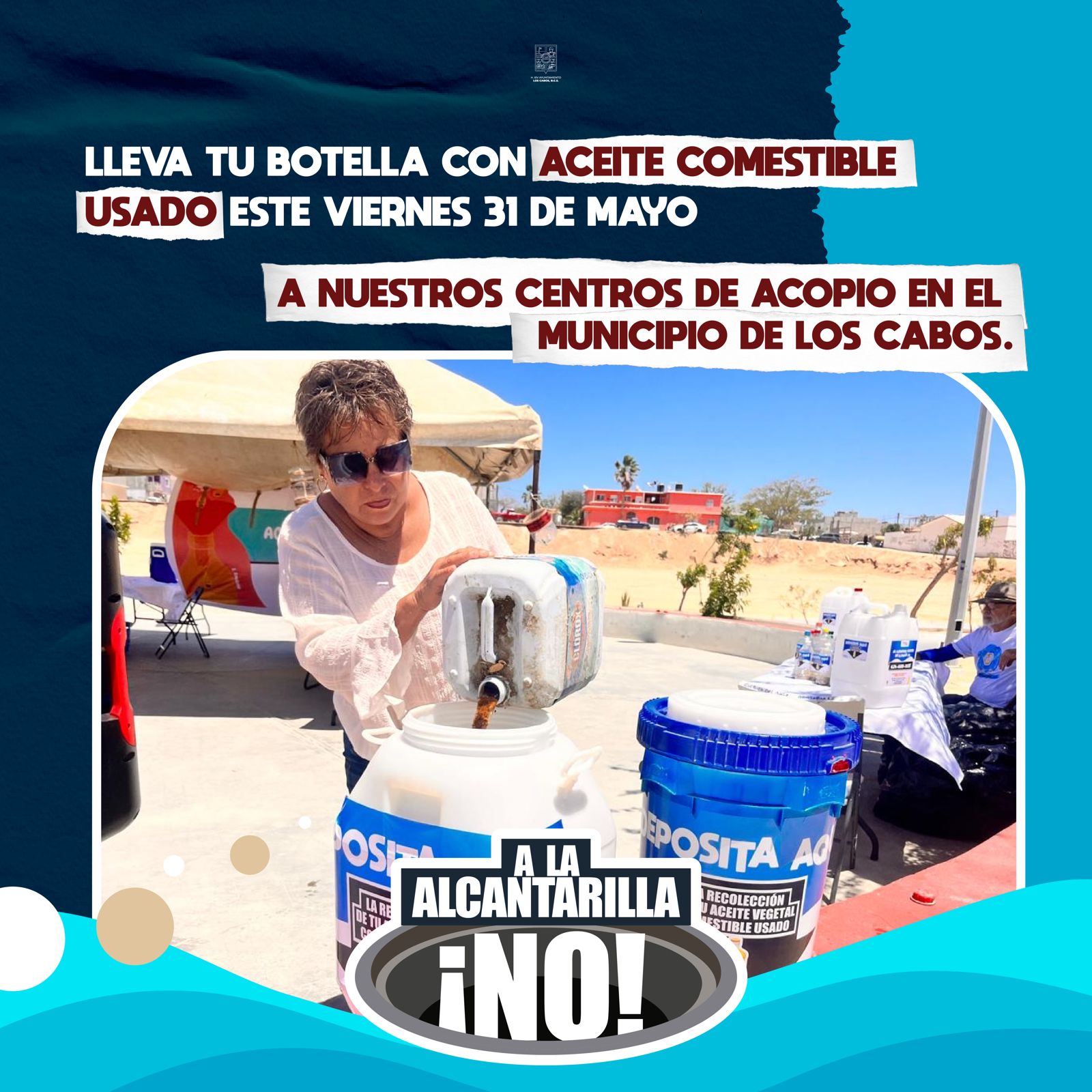 Los Cabos, B.C.S., martes 21 de mayo 2024.- Dando continuidad a la suma esfuerzos para mantener las redes del drenaje sanitario con un mejor funcionamiento, así como evitar derrames de aguas negras en el municipio de Los Cabos, personal de la Dirección de Cultura del Agua continúa implementando la campaña “Recolección de aceite vegetal usado”.