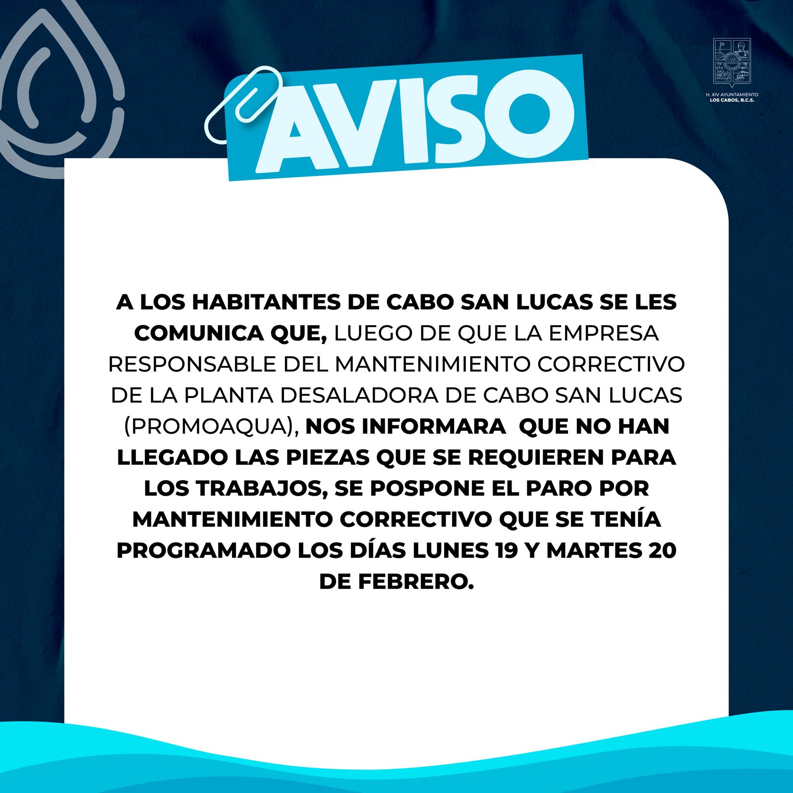 Los Cabos, B.C.S., 19 de febrero.- Luego de que la empresa responsable del mantenimiento correctivo de la planta desaladora de Cabo San Lucas (PROMOAQUA) informará que no cuentan con las piezas que se requieren para los trabajos, se pospone el paro técnico que se tenía programado para los días lunes 19 y martes 20 de febrero, lo que permitirá continuar con la programación del tandeo de agua potable de las 48 colonias y sus derivaciones que dependen de esta fuente y evitar que se afecte principalmente a los 19 sectores que se verían comprometidos con dicho mantenimiento.