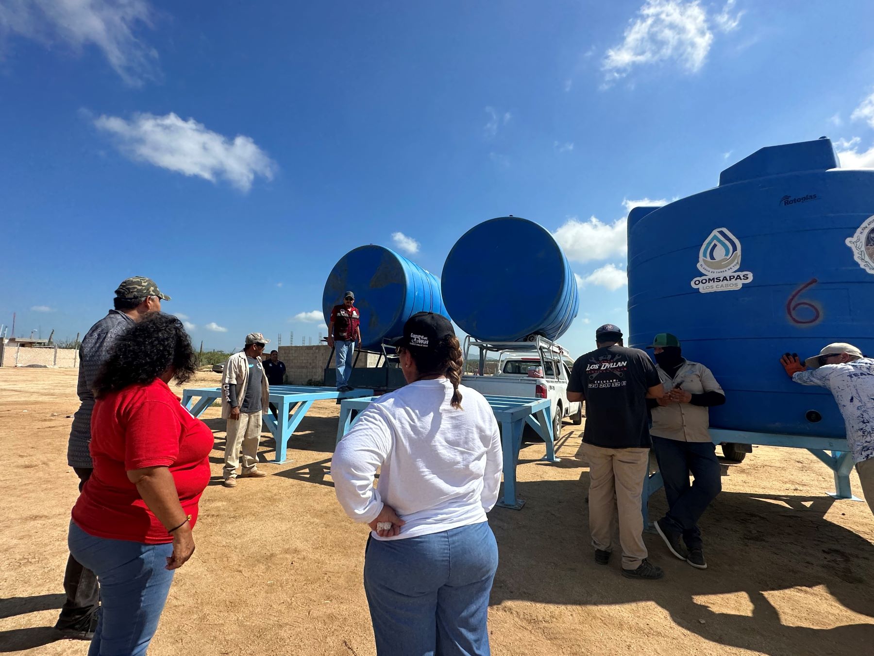 Los Cabos, B.C.S., viernes 29 de septiembre 2023.- A fin de cumplir la encomienda del presidente municipal Oscar Leggs Castro de llevar el vital líquido a todos los sectores sin distinción, el equipo del Organismo Operador del Sistema de Agua Potable, Alcantarillado y Saneamiento de Los Cabos dirigido por el ingeniero Ismael Rodríguez Piña realizó la instalación de los 8 tinacos comunitarios de 10 mil litros que se entregaron en la colonia Mezquites de Cabo San Lucas, mismos que serán abastecidos mediante pipas agua potable.