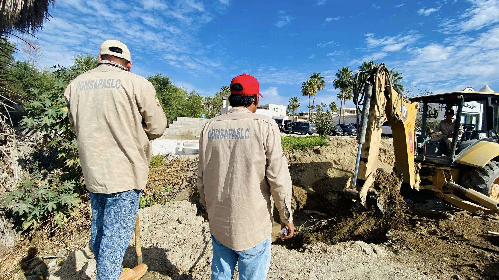 Los Cabos, B.C.S., martes 07 de febrero 2023.- Luego de que se reportara una fuga en el acueducto #2 Cabo Bello-Tanque Mil de Lomas del Sol, -a la altura de Sierra Dorada-, el equipo del OOMSAPAS que dirige Ismael Rodríguez Piña, trabaja en la reparación de la fuga para poder suministrar agua potable a las colonias Lomas del Sol lll (etapa baja y alta), Gastélum, Paraíso del Sol, Mesa Colorada ll y Caribe.